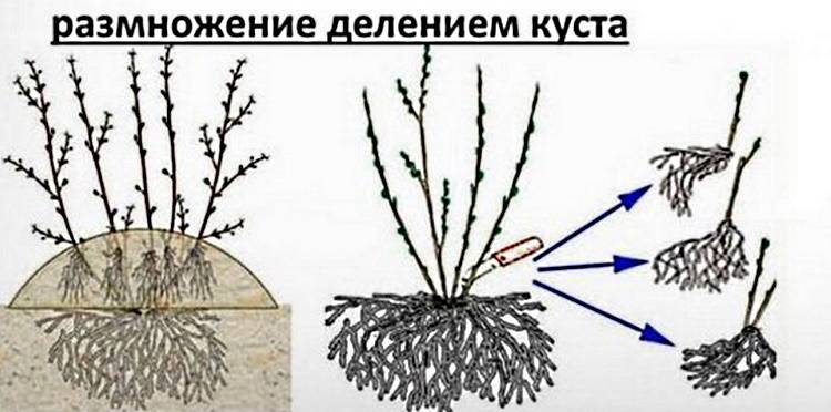 С остър резец нарежете храста на парчета, всеки от тях трябва да съдържа поне 2 млади стъбла. Резниците се засаждат в предварително подготвени дупки с плодородна почва, разлята с вода с добавка на фунгицидни препарати. Използването на разтвор на Fitosporin-M ще помогне да се предпазят корените на растенията от гъбични инфекции.