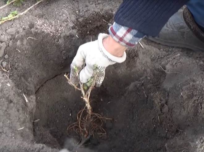 - В ямата се поставя разсад, корените се изправят.