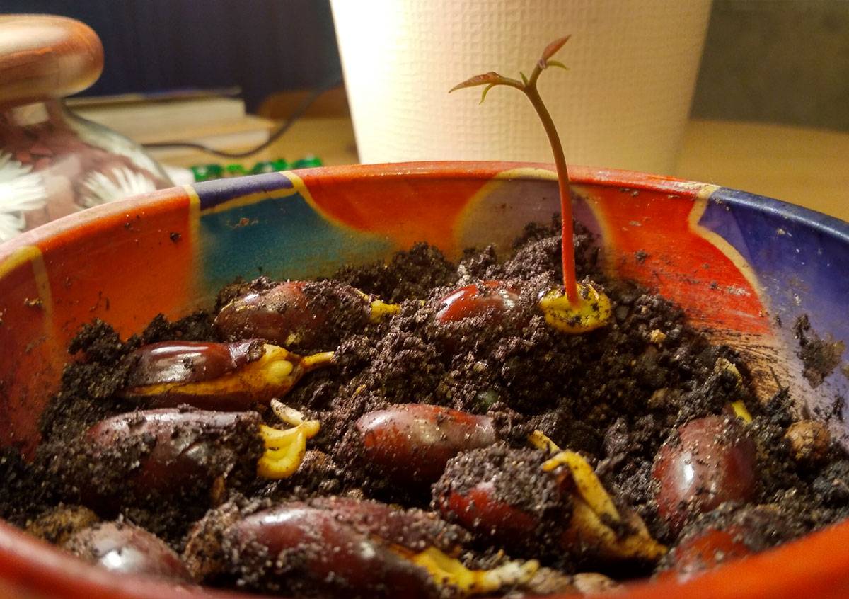 Преди да получите младо растение, ще е необходимо да осигурите подходящи грижи за разсада. За да направите това, е необходимо да поддържате контейнер със семена при температура най-малко 25 ° C и постоянно да поддържате влагата в почвата. При най-благоприятните условия, след засаждането, кълновете ще се появят след 1 седмица. Но ако това не се случи, не се разстройвайте. В някои случаи на растението може да отнеме повече от месец, за да покълне.