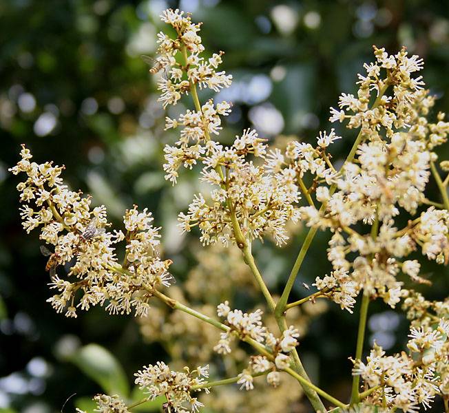 Цветовете на дървото са малки, събрани в големи гроздове съцветия. Тяхната сянка може да варира от бяло до светло лилаво.