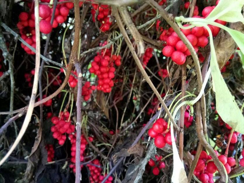 На мястото на избледнелата пъпка се появява четка с плодове с дължина до 10 см. Плодовете са червени, сферични, малки, не повече от 0,5-1 см всяка. Всяка четка съдържа 15 до 25 плода. Плодовете имат специфичен вкус.