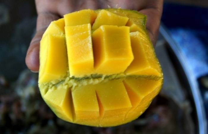 В тропиците у дома дървото достига височина 45 метра, има пищна сферична корона с тъмнозелени листа, младите листа са жълто-розови. Цъфтежът на манго издава аромат, подобен на лилия. Самият плод има продълговата овална форма с гладка жълта или жълторозова кожа. Можете да проверите зрелостта, като натиснете пръста си върху плодовете. Зрялата пулпа образува вдлъбнатина, която след това се поправя. Теглото на един плод достига два килограма.