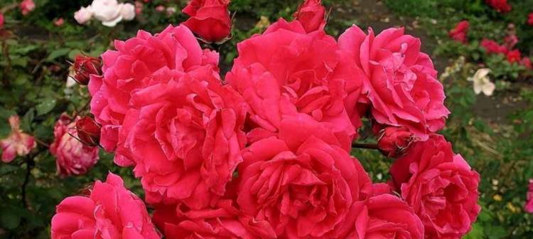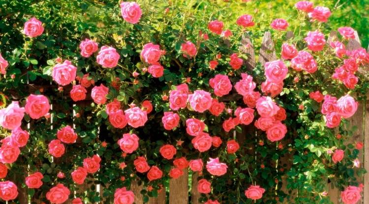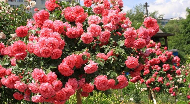 - Rosas errantes com grandes cachos de pequenas flores em hastes finas que requerem uma liga. Eles florescem em cores abundantes em julho e florescem durante todo o mês.