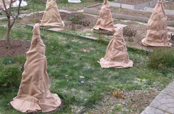 Para proteger as roseiras das baixas temperaturas no inverno, elas são cobertas com galhos de pinheiro, material de cobertura, uma caixa de papelão que, por sua vez, é envolvida por cima com filme plástico para evitar que se molhe. Antes de cobrir, os arbustos são cortados, cobertos com terra e a neve é despejada em cima do abrigo.