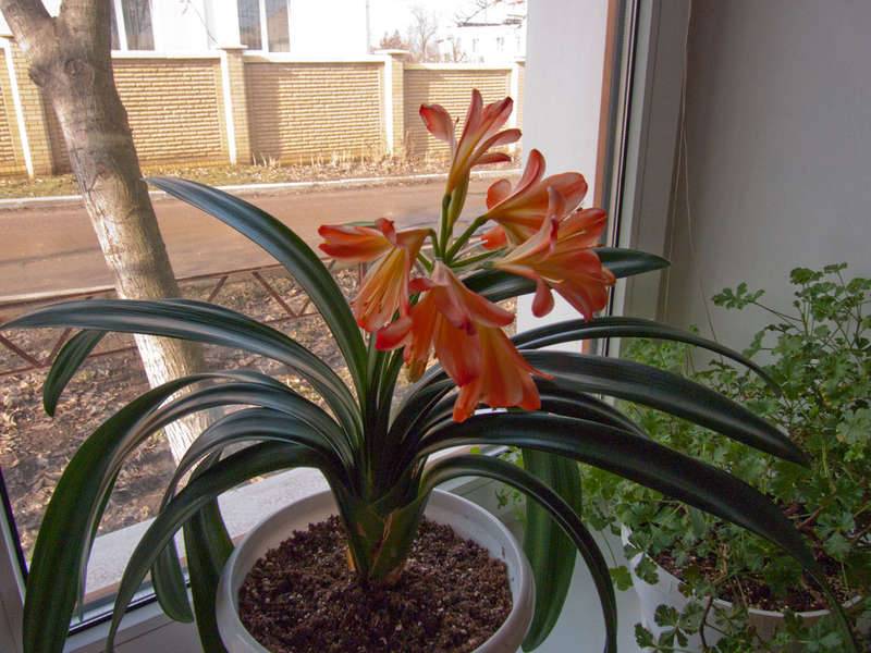 - Clivia cea frumoasă sau Nobilis (Clivia nobilis). Este o plantă perenă fără tulpini, cu frunze adunate într-o rozetă care arată ca o sabie. Din flori în formă de clopot, se formează inflorescențe în formă de umbrelă sau racemoase, 14 buc. Florile sunt portocalii cu o nuanță roz. Înălțimea clivia portocalie poate fi de 30-50 cm.