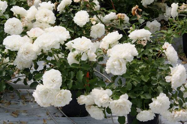 - Flori de Terry, de culoare exclusiv albă, lipsite de aromă. Diametrul mediu este de 6-9 cm. Numărul petalelor este de 60-70;