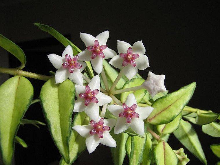 Цветът на Hoya Bella variegata, или пъстър (Hoya Lanceolata ssp. Bella cv. Variegata) се нарича така поради наличието на жълтеникав център върху листата.