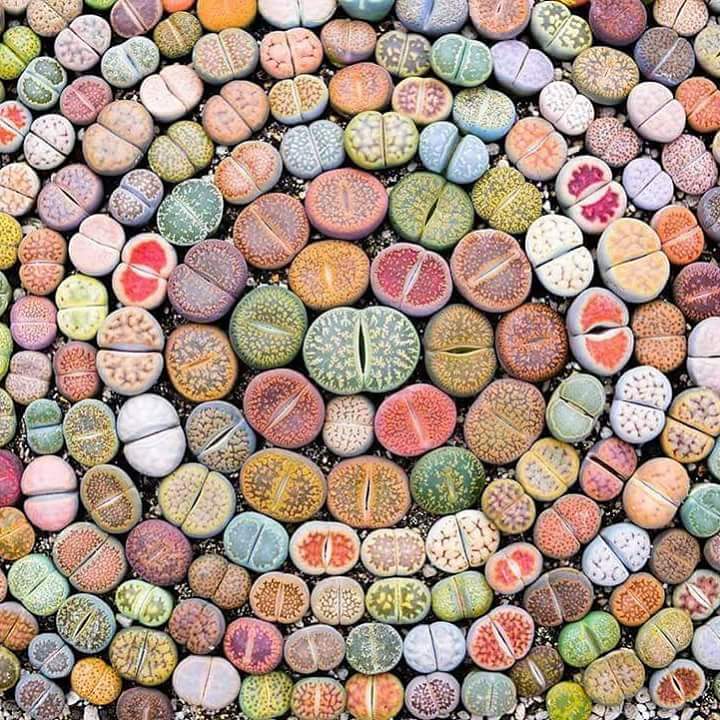 - кафеникав литопс е удивителна декоративна култура, чийто външен вид наподобява камъни. Заоблените листни плочи са оцветени в кафеникавокафяв цвят. На върха на листата има точки и петна. Височината на багажника достига 3 см. Жълтите съцветия са големи по размер;