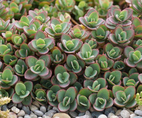 Расте като килим, не се страхува от студено време, закърнява. Овалната зелена зеленина променя цвета си на лилав или бронзов след измръзване. Лилаво оцветените съцветия украсяват градината от юли до август. Sedum spurium е представен от следните видове: