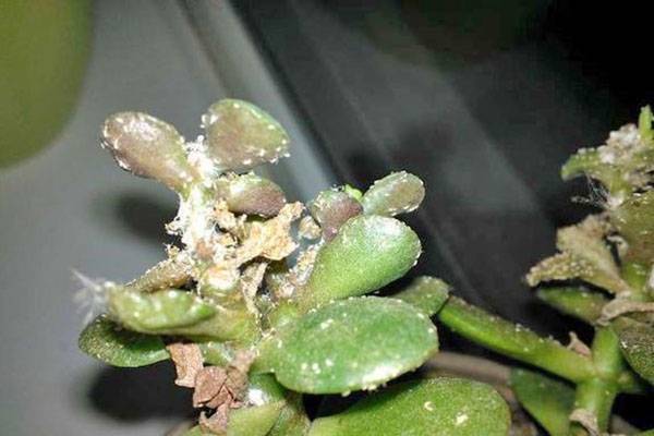 - Mealybug - появата на стъблото или в пазвите на листата на образувания, наподобяващи памучна вата, говори за атаката на това насекомо. Цветето трябва да се извади от саксията и внимателно да се изследва кореновата система - вредителят обича да подрежда гнездо в него. Растението се напръсква с Aktellik, Fitoverm или Inta-Vir.