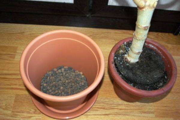 - Контейнер - контейнерът трябва да има дренажни отвори, освен това дъното му е облицовано с експандирана глина. Размерът на саксията трябва да отговаря на стандартите - не надвишавайте диаметъра на кореновата система с повече от 3 см. При засаждане на цвете то е покрито със земя само до горните участъци на корените, а не по-високо.