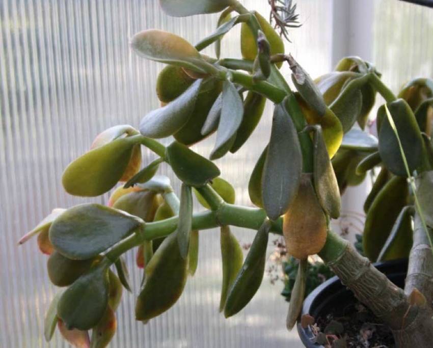 Подобна ситуация ще се случи и с излишък на слънчева светлина и пълна липса на напояване. Когато земният бук изсъхне напълно, листата започват да изсъхват и те напълно отпадат. Ето защо, когато поливате, си струва да се придържате към златната среда. Crassula се полива веднъж на всеки 2 дни през лятото и веднъж седмично през зимата. Важно е да осигурите на растението добър дренаж.
