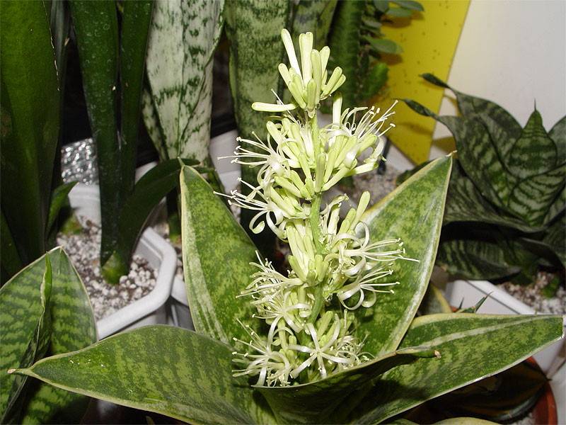 Ако се грижи правилно, сансевиерията може да цъфти. Това се случва през топлия сезон. Малки бели цветя и тънък деликатен аромат.