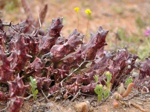 Многогодишен храст с тетраедрични месести издънки достига височина 60 см. По ребрата на стъблата има меки тънки издънки. Цветът на короната е тъмно лилав, поради липсата на листа, цветът понякога се бърка с кактус.