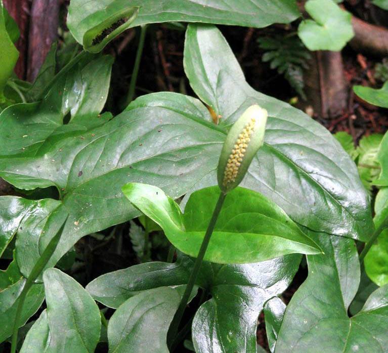 При младо цвете листата са големи, с форма на копие, а при възрастен те са разделени на 3 дяла. Дължината им е до 10 см. Цветът е наситено зелен със сребриста ивица в средата. Повърхността е гладка, лъскава, кадифена. Съцветие под формата на извито ухо с воал, който има червеникав оттенък отвътре и зелен отвън.