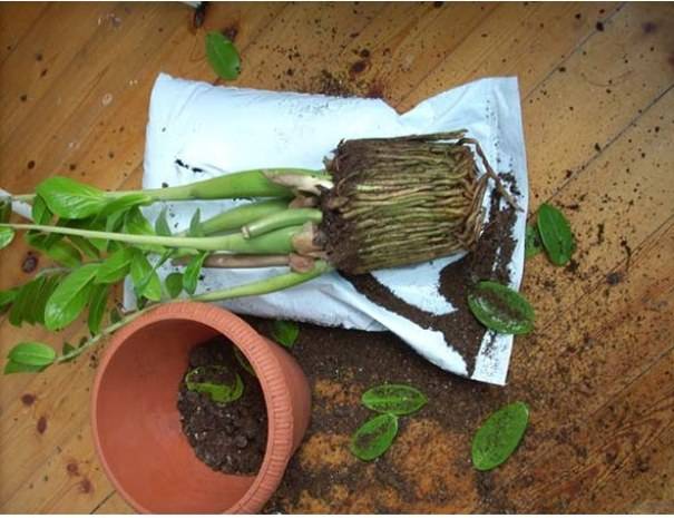 Zamioculcas расте бавно, трябва да се трансплантира в началото на вегетационния период, докато цветето навлезе във фазата на активен растеж. Подрязването се извършва, когато старите клони отмират.