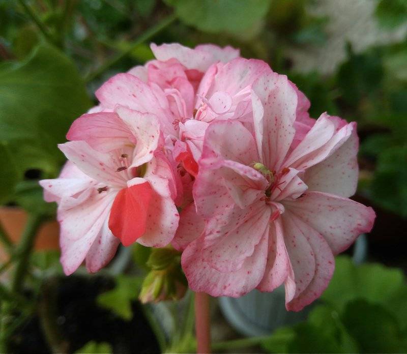 ช่อดอกของ pelargonium พันธุ์นี้มีแกนสีเขียว แต่ส่วนที่เหลือของสีของกลีบดอกเป็นสีขาวหรือสีชมพูอ่อนมีปื้นสีชมพูเข้ม ดอกไม้ของ Pelargonium Sutarve Nadya K ไม่ได้ถูกยัดไส้มากนัก