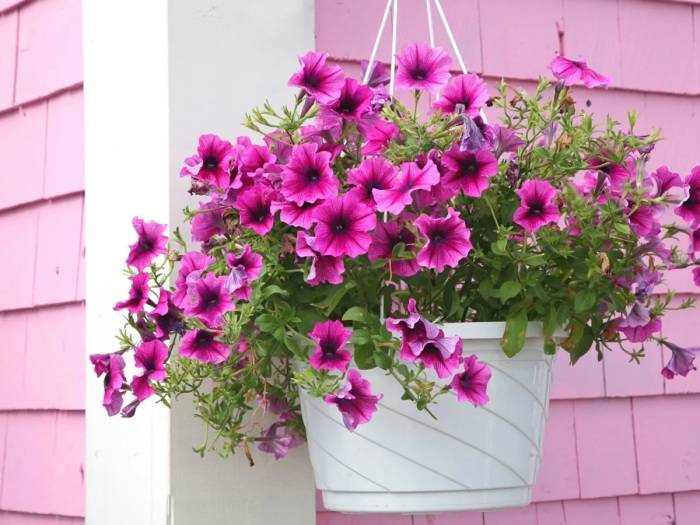 Ampel petunias เนื่องจากยอดที่ออกดอกจึงเหมาะที่สุดสำหรับเครื่องปลูกแขวน ความยาวของลำต้นแตกต่างกันไปตั้งแต่ 30 ถึง 120 ซม. พุ่มไม้ปกคลุมดอกไม้รูปกรวยอย่างล้นเหลือ ส่วนใหญ่มักปลูกเป็นไม้ยืนต้น