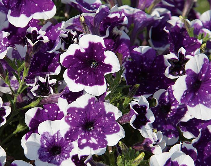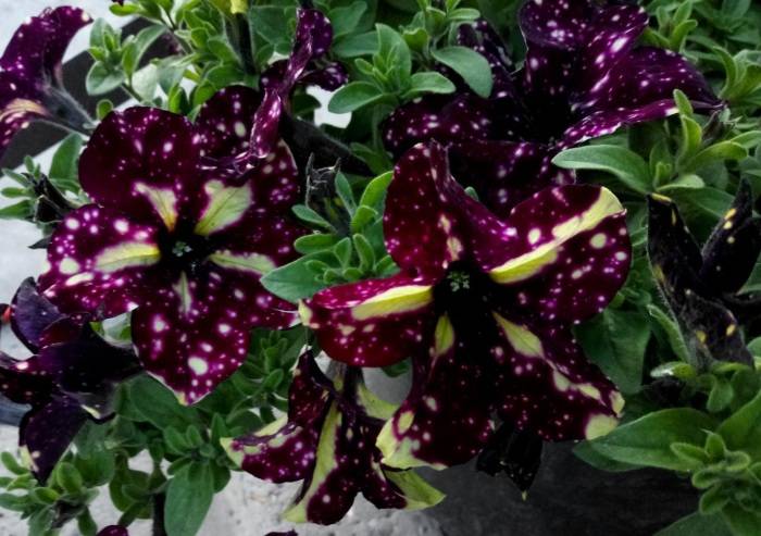 Petunia Stormy sky - พันธุ์ที่มีสีแปลกตาของกลีบดอก มีสีแดงไวน์เข้มและมีจุดสีขาว ในแสงที่มีแสงจ้ามีสีเหลืองอ่อนเป็นรูปเพชรปรากฏบนกลีบดอก