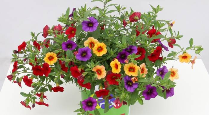 Calibrachoa เป็นดอกไม้ที่ดูเหมือนพิทูเนีย แต่ไม่ใช่ พวกมันยังอยู่ในวงศ์ Solanaceae หน่อมีความยาวสูงสุด 1.5 ม. ดอกไม้มีจำนวนมาก แต่มีขนาดเล็กเส้นผ่านศูนย์กลางไม่เกิน 3 ซม. ตรงกลางของกลีบดอกจะมีสีเข้มกว่าเสมอ (ในสายพันธุ์ธรรมชาติสีเหลืองหรือสีดำ)