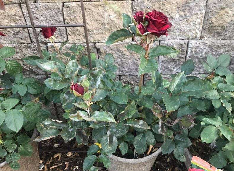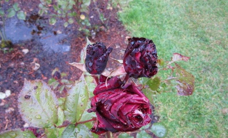 ในสภาพอากาศชื้นและเย็นดอกกุหลาบสีดำอาจได้รับผลกระทบจากโรคเชื้อรา - เน่าและสนิมสีเทา อาการแรกของรอยโรคคือจุดสีขาวหรือสีน้ำตาลบนใบไม้ วิธีป้องกันและต่อสู้กับโรคคือการรักษาด้วยสารละลายคอปเปอร์ซัลเฟตหรือของเหลวบอร์โดซ์