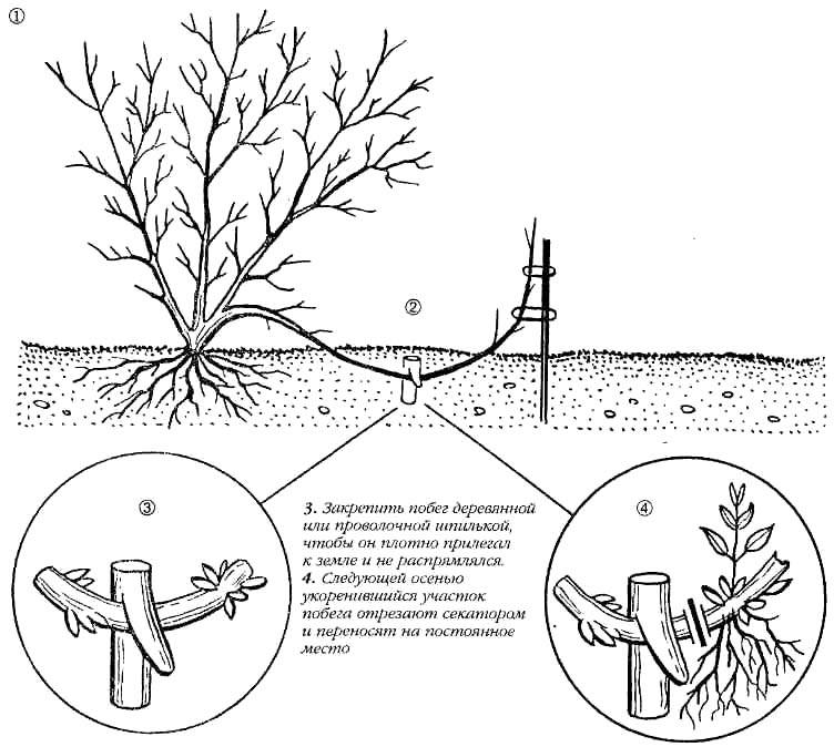 - การแบ่งชั้น วิธีนี้ง่ายที่สุด แต่สิ่งสำคัญคือกิ่งก้านจะยาวและแข็งแรง ช่วงครึ่งหลังของฤดูร้อนเป็นช่วงที่ดีที่สุดสำหรับการผสมพันธุ์โดยการฝังรากลึก มีความจำเป็นต้องเตรียมดินแดน: กำจัดวัชพืชขุดให้ดีและใส่ปุ๋ย ต้องตัดกิ่งที่อยู่ด้านล่างและเสียบไม้ขีดไฟไว้ที่นั่น ยึดกับดินด้วยลวดหลักโรยด้วยดินและน้ำ ผูกส่วนบนของกิ่งกับหมุด ในฤดูใบไม้ผลิสามารถแยกออกจากพุ่มไม้และปลูกถ่ายได้