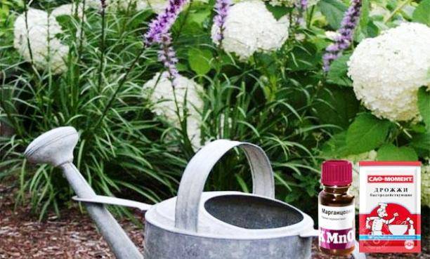 Kovanın üçte biri kuru ekmekle, geri kalanı doğranmış otla doldurulur. Suyu dökün, örtün ve bir hafta bekletin. Fermantasyonun başlamasından sonra bileşim süzülür. Konsantre, 1: 5 oranında seyreltilir. Bu döllenme, ortancanın büyümesini ve çiçeklenmesini sağlayacaktır.