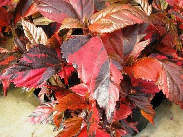 Цветовете на листата са различни: от светлозелени тонове до червеникавокафяви. Размери до 25 см, а при домашните растения 10-15 см. Малки цветя се събират в пухкави пурпурночервени съцветия с дължина до 30 см, които плавно падат в красиви потоци.