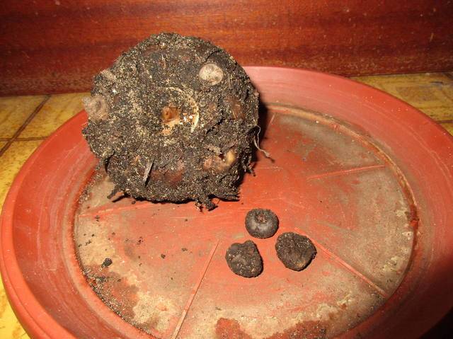 Луковиците трябва да бъдат внимателно проверени преди презасаждането. Когато се появят гнили участъци, е необходимо внимателно да ги изрежете с дезинфекциран нож и да обработите мястото на среза с натрошен въглен или дезинфектант. За един ден грудката трябва да остане на открито, за да изсъхне. След това засадете аморфофалуса в нова саксия.