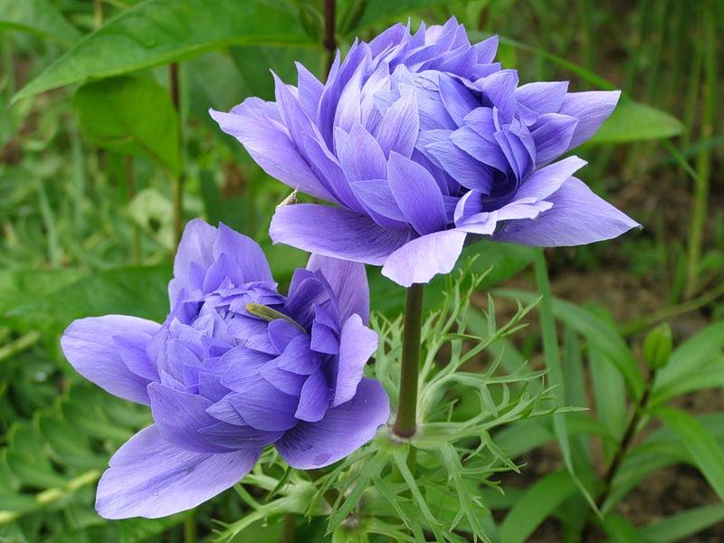 - Тери синя анемона прилича на божур. Съцветията са гъсто двойни, сянката варира от синьо до синьо. Стъблата са ниски. Той е непретенциозен в грижите, но обича сянката и навременното редовно поливане;