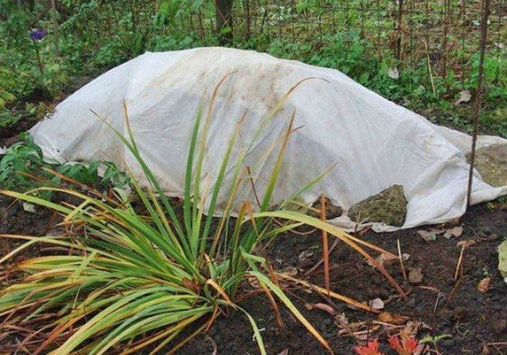 Ако има вероятност от замръзване под -37 ° C, тогава разтоварванията определено ще се нуждаят от подсилен подслон. На върха на многогодишни храсти, покрити с мулч, са инсталирани дъги, между които се излива суха зеленина. Панелите Lutrasil или spandbond се изтеглят. Оставете ги до май.Ако пъпките се събудят по-рано, тогава зеленината няма да ги спре да растат и няма да има заплаха от замръзване.