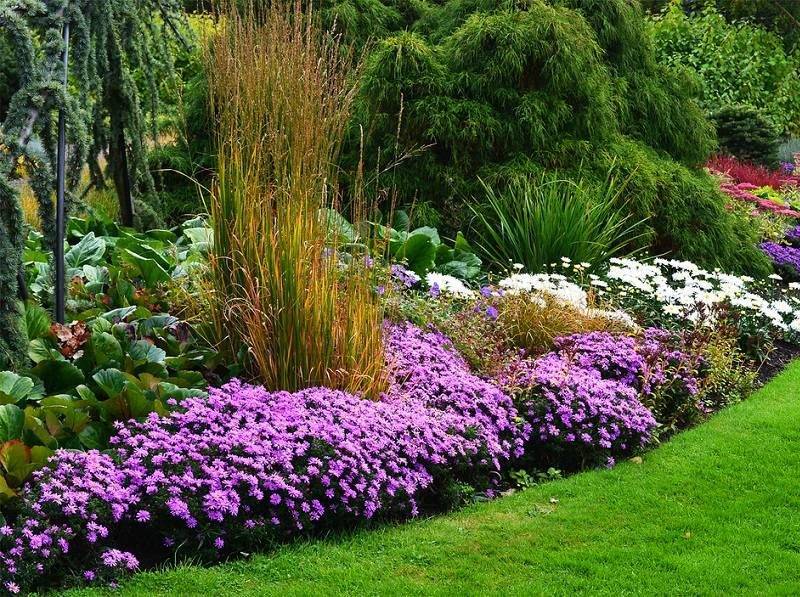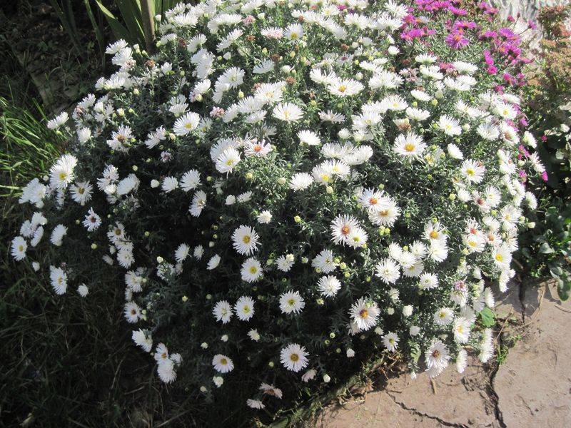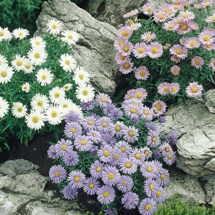 Алпийски астри: Dunkle Sean, Alba, Ruper, Gloria. Сортовете джуджета хармонично украсяват граничните зони и малки цветни лехи.