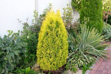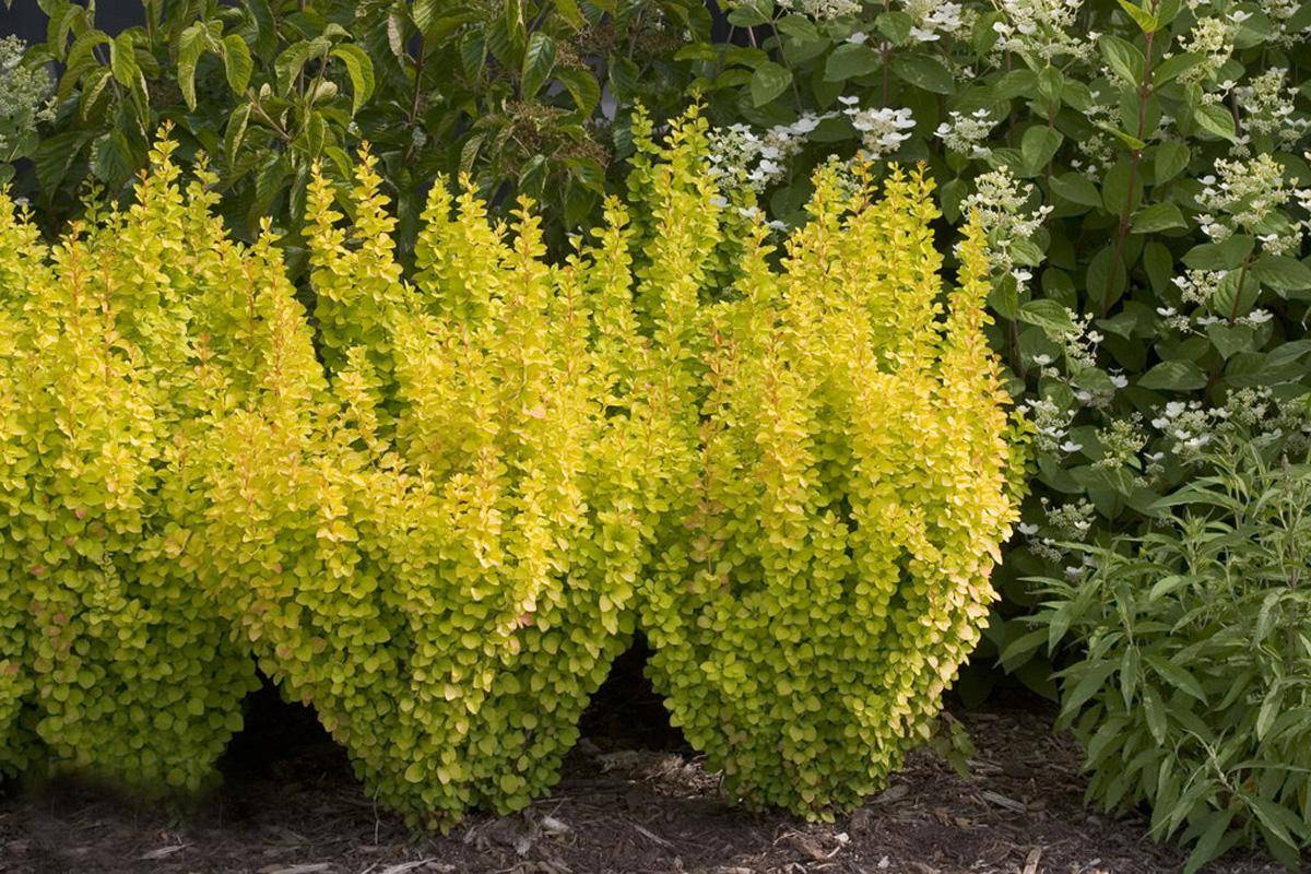 Берберис може да се превърне в декорация на миксборд, когато се комбинира с растения с контрастни нюанси. Необходимо е да се подбират култури не само по цвят, но и по форма. Златната ракета на Thunberg Golden Rocket ще изглежда не по-малко впечатляващо като тения.