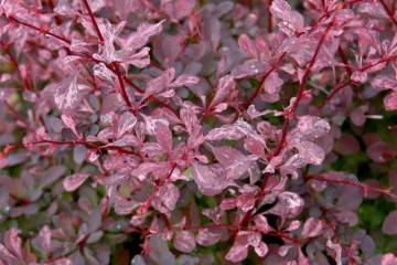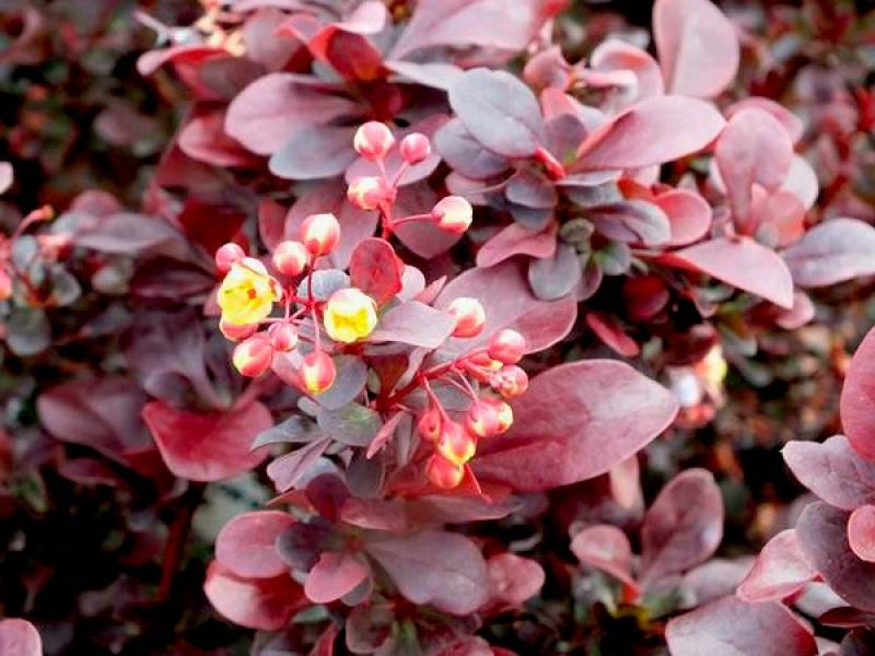 - берберис Pau Wow изглежда по-малко ярък от другите сортове Thunberg. Но понякога производителите на цветя не искат необичайни, ярки петна и за завършване на композицията се нуждаят от нещо компактно, спретнато в обичайния цвят. В този случай на мястото трябва да се засади сортът Powwow. Това е малък, до 120 см височина, храст, чиято ширина може да достигне 80 см. Листата са малки, не по-големи от 2 см, светло зелени, през есента те стават обичайния жълт или оранжев цвят. Също така на храста се появяват красиви яркочервени плодове, благодарение на които той се откроява на общия фон. Подходящ за отглеждане в Централна Русия;