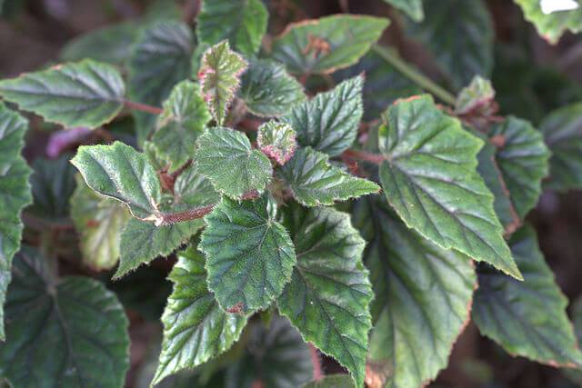 При растенията от рода Begonia горната част на листа може да бъде монотонно зелено или други цветове с различни петна, удари, шарки. Долната част има нюанси на червено, кафяво и тъмно лилаво. Стъблата и листата на много видове са покрити с фини люспи.