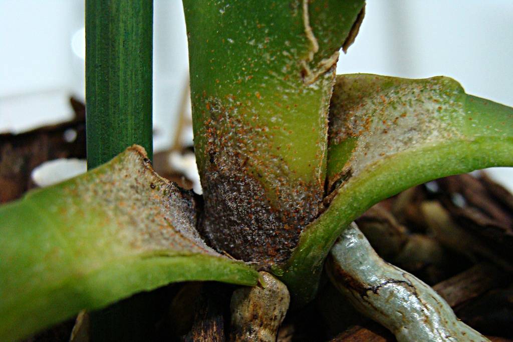 Както и в предишния случай, причината за заболяването е неправилна грижа. Поради прекомерното поливане, повърхността на почвата е уплътнена, тя не позволява на въздуха да премине добре, така че кореновата система започва да гние.