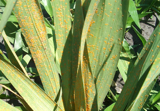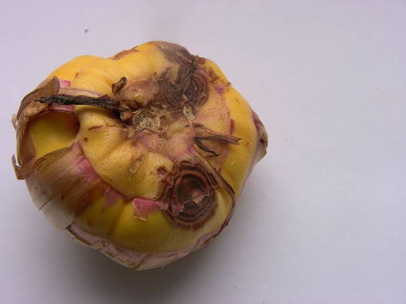 Симптомът говори за сериозно увреждане на кореновата система. На крушката се появяват малки ръждясали петънца (често с големината на точка). В бъдеще ръждата се разпространява по листата, провокирайки появата на малки мехурчета.