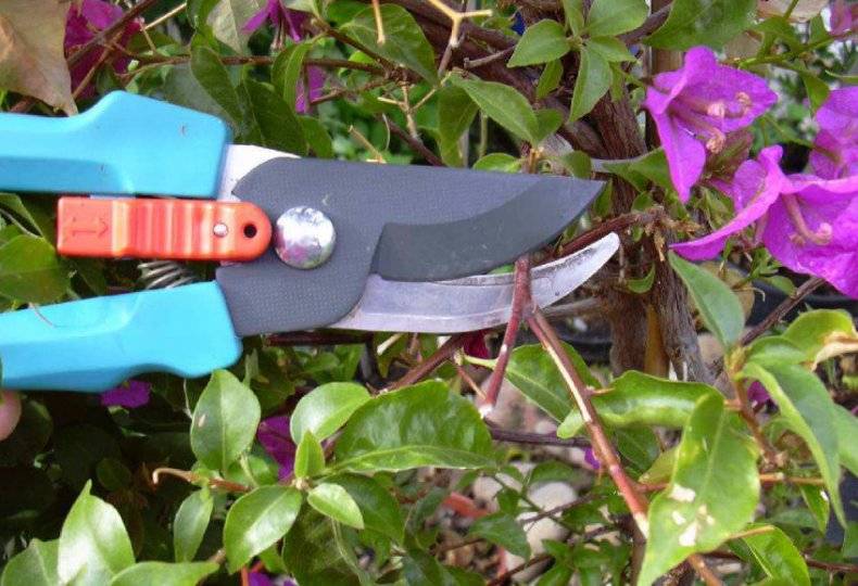 - Подрязване. Дървото се нуждае от формиране на корона. Освен това резитбата на бугенвилията е стимул за по-нататъшен успешен цъфтеж. По време на процедурата остават до 7 см издънки за текущата година, тъй като цветните пъпки са поставени в краищата на клоните. Съответно, по време на формирането на короната на бугенвилията, колкото по-дълги са издънките, толкова по-лош ще бъде цъфтежът.