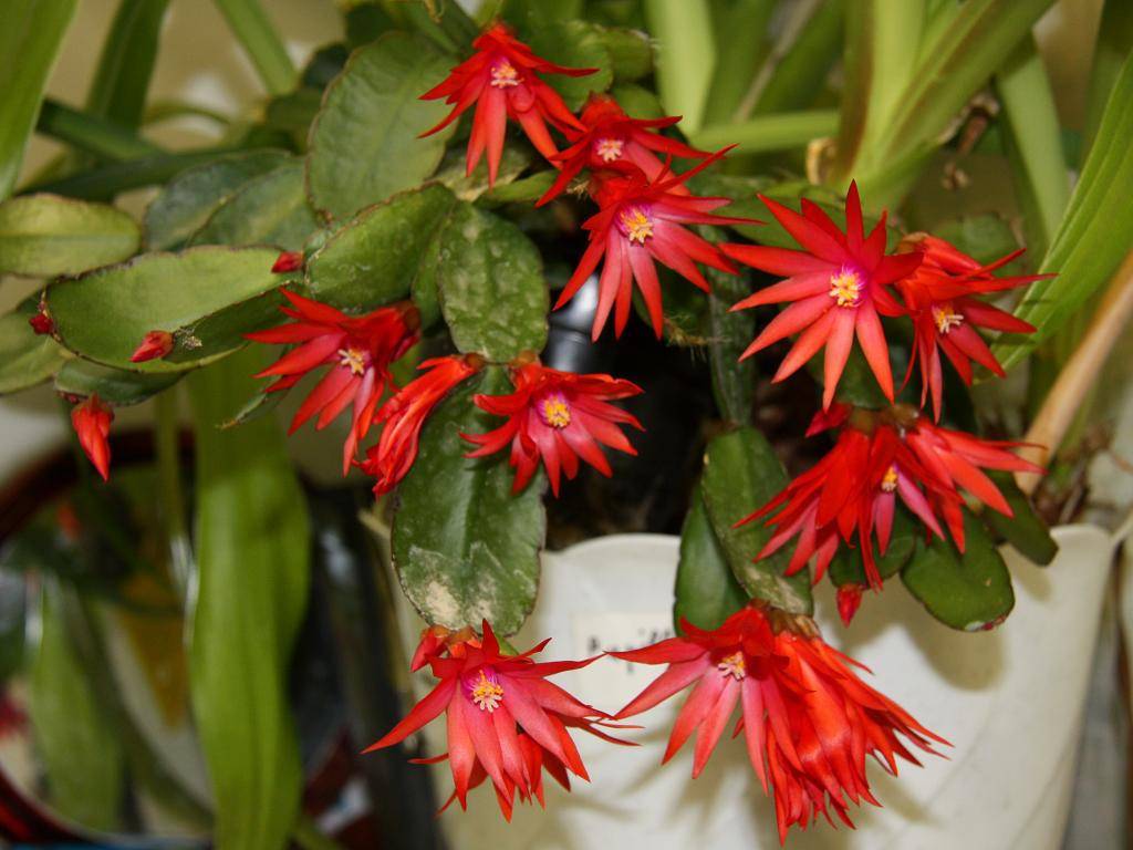- всички пъпки са паднали, Schlumberger не цъфти. Причина: стрес, саксията е преместена от място на място по време на периода на цъфтеж, което е строго забранено. Растението стоеше в течение или на пряка слънчева светлина. Имаше прекалено поливане или, напротив, недополиване. За съжаление в този случай може да се направят само изводи защо това се е случило и да се предотвратят подобни грешки през следващата година.