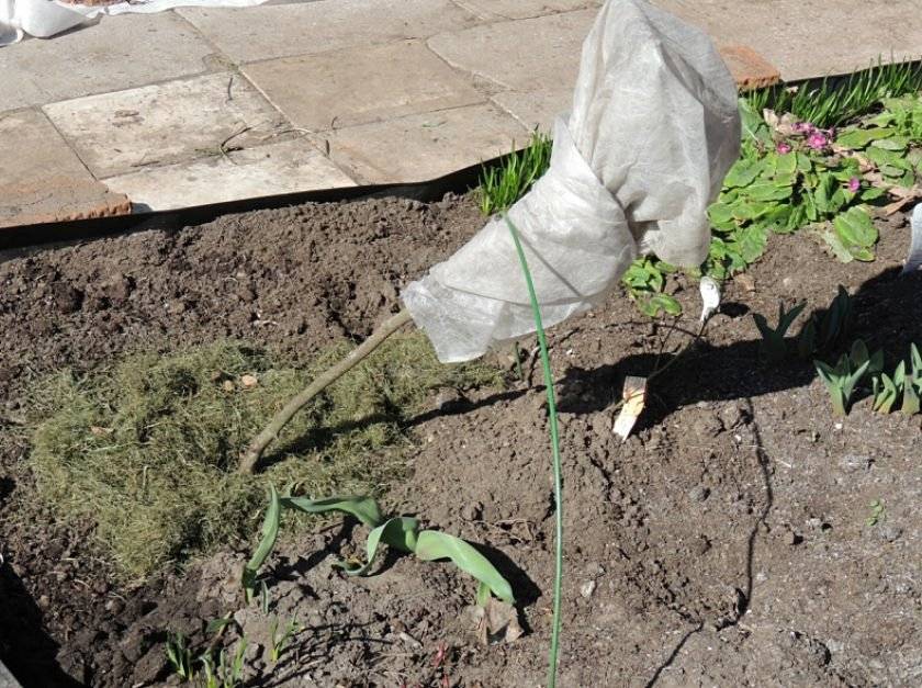 Короната е обвита със специална изолация, а багажникът е огънат към земята. Това се прави много внимателно, за да не се счупи. За да направите това, можете да използвате специални скоби или да забиете колче на 20 см от основата на багажника и да завържете стъбло към него. Короната трябва да е възможно най-близо до почвата. Покрита е със смърчови лапи, покрита с листа и друг слой смърчови клони, който няма да позволи на листата да се разпръснат.