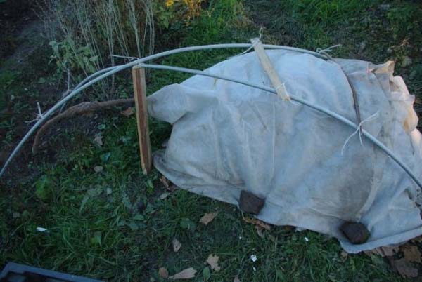- Огъването в основата на стъблото трябва да бъде от страната, противоположна на наклона, т.е. ако огъването е вдясно от колчето, тогава при покриване трябва да се огъне надясно. Страната на завоя трябва да се запомни, като се намерят някои забележителности.