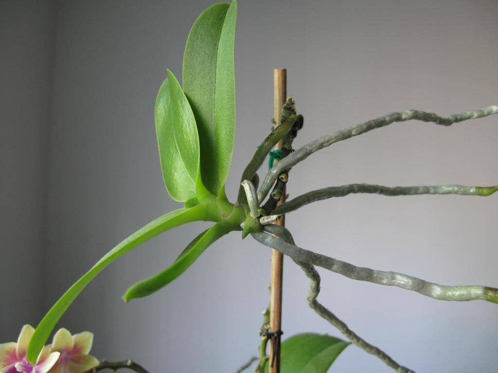 Бебето на орхидея на дръжка на външен вид наподобява малък процес с 2 или 3 листа. Коренът започва да расте много по-късно или може изобщо да не расте. Скоростта на растението на бебето зависи от правилната грижа за орхидеята. При правилния подход корените могат да се появят след 3 месеца, а в противен случай след шест месеца.