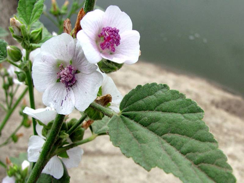 Цветовете са големи, бяло-розови на цвят, разположени на къси дръжки.