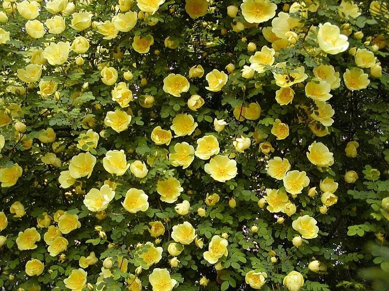 Това е дива жълта роза, която цъфти преди всичко от сортовете.