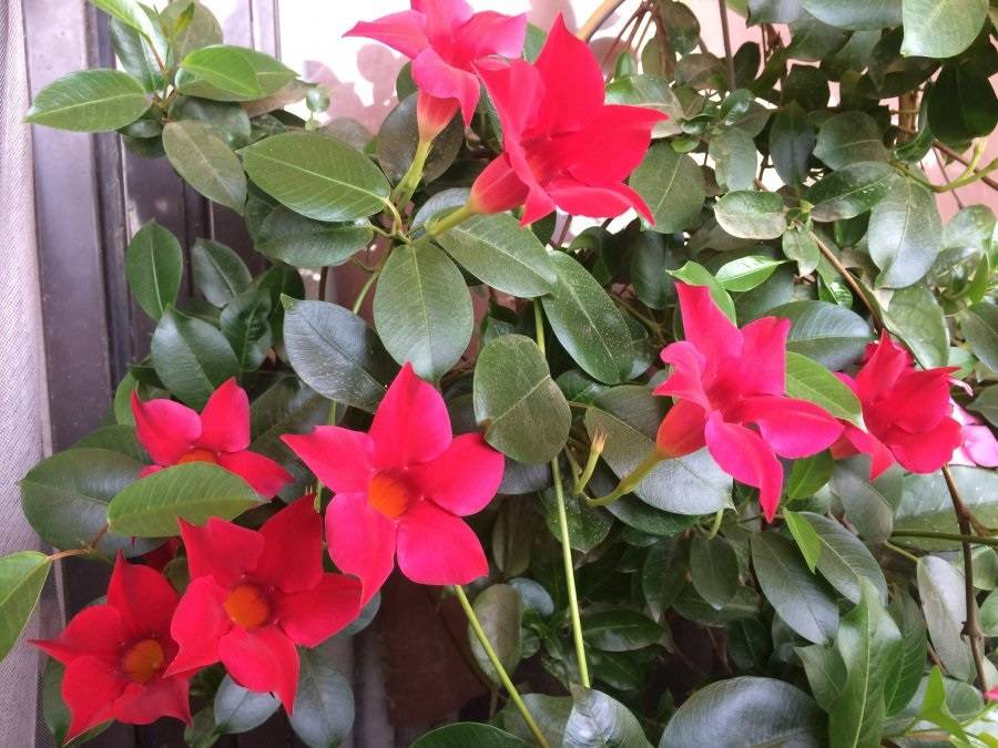 Бързо растяща вечнозелена лоза с гладки клони. Листата са дебели, овални, леко заострени в краищата, дълги 5 см. Цветята образуват гроздове от 3-5 бр. Цветът на тази диплодения е розово-червен с жълто гърло.