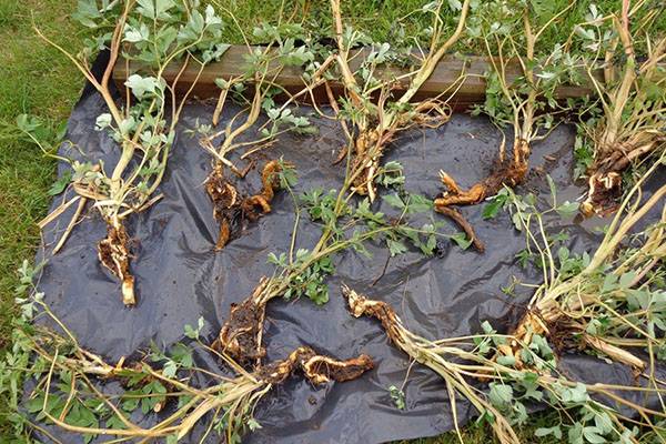 Мястото на среза се обработва с активен въглен на прах или пепел, корените се сушат в продължение на 3 часа. След това се извършва трансфер на предварително подготвено място.