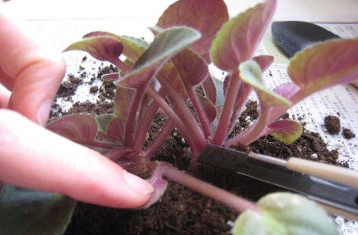 Възрастен Сенполия увеличава дъщерните си розетки. Растение в това състояние в саксията има малко място за развитие, така че децата трябва да седят. За да направите това, майчиният храст се отстранява внимателно от контейнера, младите гнезда се отделят, всяка секция се засажда отделно.