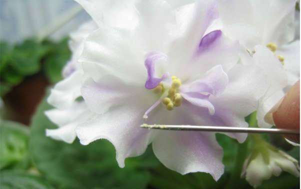Поленът от повърхността на тичинките на виолетовата папа се прехвърля към навлажнената повърхност на плодника.