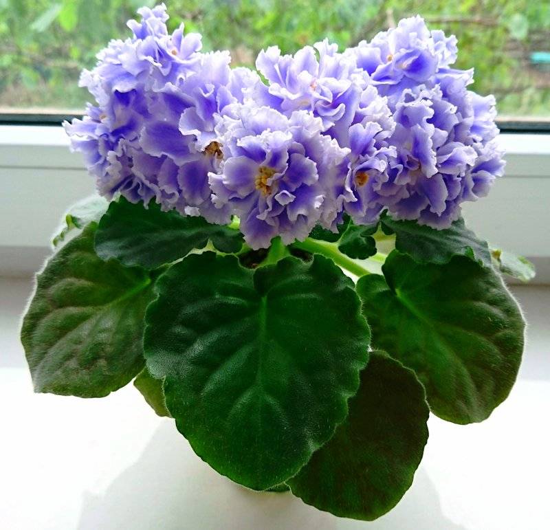 Листата на този сорт са кадифени, с овална форма и сърцевидни закръгления на дръжката. Външната част на листа може да бъде оцветена в различни нюанси: от светло до тъмно зелено. Долната повърхност е светло зелена или люлякова. Големи небесносини цветя със сферична форма с по-светъл гофриран ръб се събират в буйни съцветия и се издигат над розетката.