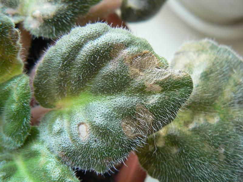 Листните плочи на теменужките могат да пожълтеят или да се оцветят. Това означава, че растението се нуждае от трансплантация, то е прекалено осветено, прехранено с торове или е било нападнато от вредни насекоми.